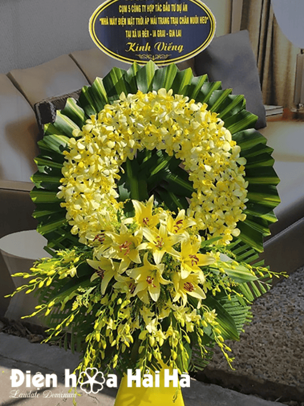 Mẫu vòng hoa sử dụng hoa lan vàng chủ đạo, tượng trưng cho sự cao quý, lòng kính trọng và sự viên mãn của một cuộc đời trọn vẹn. Nên thích hợp gửi viếng người mất lớn tuổi đã sống một đời viên mãn. Hoặc khi cần một mẫu hoa trang nghiêm, tinh tế nhưng không quá u buồn.